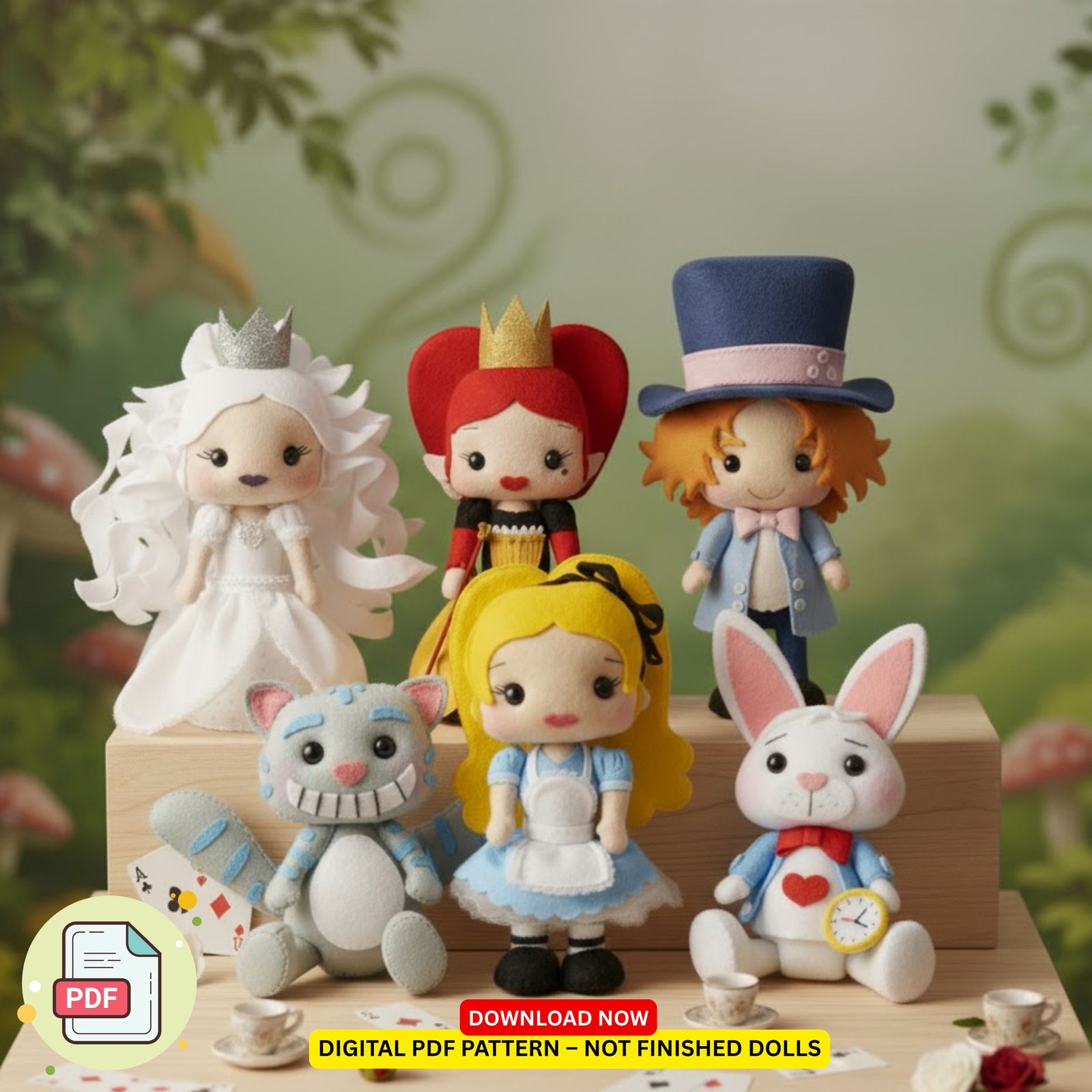 Step into Wonderland with the ultimate felt pattern bundle featuring all six beloved characters from the magical world we all adore. This exclusive PDF pack from FeltHaven brings together: